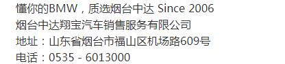 【公司简介】 2006年,BMW授权经销商烟台中达翔宝成立。烟台中达翔宝是港城首家BMW授权经销商,一直努力为港城市民提供创新的产品和服务,传递BMW之悦,并积极投身于社会公益事业。烟台中达翔宝不但经销BMW全线的车型,并且提供高效的维修服务并拥有先进的保养服务技术。经验丰富的专家将竭诚为您提供优质贴心的服务;纯正的原厂配件及全国统一的合理价格,公开、透明。同时能够以积极的服务态度及时解决问题,满足客户的个性化需求,让港城BMW车主尽享便捷。选择BMW卓越经销商,体验中达20年品牌积淀, 感受最纯粹的BMW之悦。