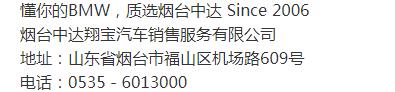 【公司简介】 2006年,BMW授权经销商烟台中达翔宝成立。烟台中达翔宝是港城首家BMW授权经销商,一直努力为港城市民提供创新的产品和服务,传递BMW之悦,并积极投身于社会公益事业。烟台中达翔宝不但经销BMW全线的车型,并且提供高效的维修服务并拥有先进的保养服务技术。经验丰富的专家将竭诚为您提供优质贴心的服务;纯正的原厂配件及全国统一的合理价格,公开、透明。同时能够以积极的服务态度及时解决问题,满足客户的个性化需求,让港城BMW车主尽享便捷。选择BMW卓越经销商,体验中达20年品牌积淀, 感受最纯粹的BMW之悦。