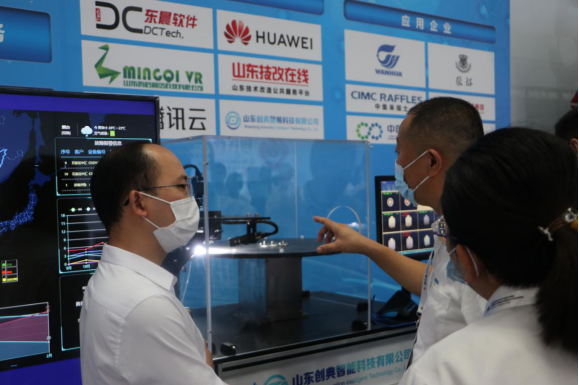 在现场展示区,烟台移动工作人员为嘉宾讲解了5G+工业互联网平台的部分典型应用场景,通过5G智能终端,实现传统设备的数字化联网,为传统产线实现赋能增效。