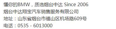 【公司简介】 2006年,BMW授权经销商烟台中达翔宝成立。烟台中达翔宝是港城首家BMW授权经销商,一直努力为港城市民提供创新的产品和服务,传递BMW之悦,并积极投身于社会公益事业。烟台中达翔宝不但经销BMW全线的车型,并且提供高效的维修服务并拥有先进的保养服务技术。经验丰富的专家将竭诚为您提供优质贴心的服务;纯正的原厂配件及全国统一的合理价格,公开、透明。同时能够以积极的服务态度及时解决问题,满足客户的个性化需求,让港城BMW车主尽享便捷。选择BMW卓越经销商,体验中达20年品牌积淀, 感受最纯粹的BMW之悦。
