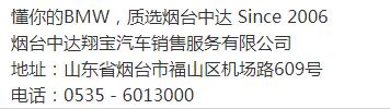 【公司简介】 2006年,BMW授权经销商烟台中达翔宝成立。烟台中达翔宝是港城首家BMW授权经销商,一直努力为港城市民提供创新的产品和服务,传递BMW之悦,并积极投身于社会公益事业。烟台中达翔宝不但经销BMW全线的车型,并且提供高效的维修服务并拥有先进的保养服务技术。经验丰富的专家将竭诚为您提供优质贴心的服务;纯正的原厂配件及全国统一的合理价格,公开、透明。同时能够以积极的服务态度及时解决问题,满足客户的个性化需求,让港城BMW车主尽享便捷。选择BMW卓越经销商,体验中达20年品牌积淀, 感受最纯粹的BMW之悦。