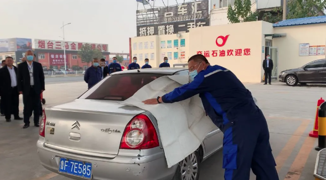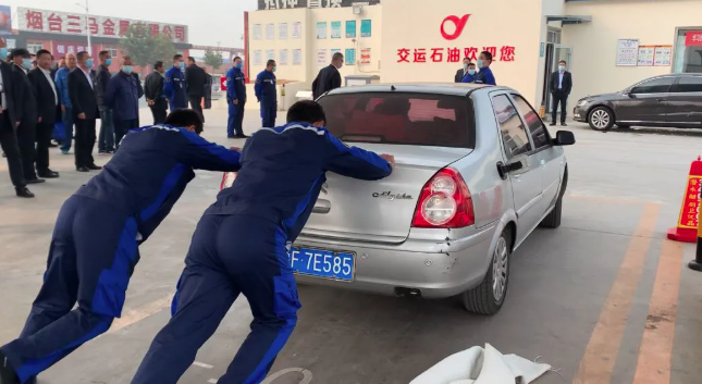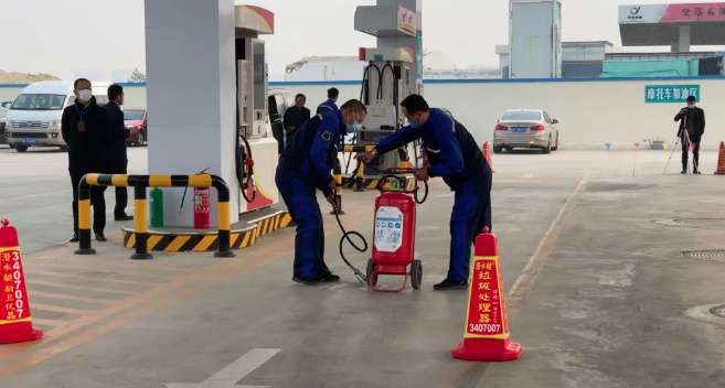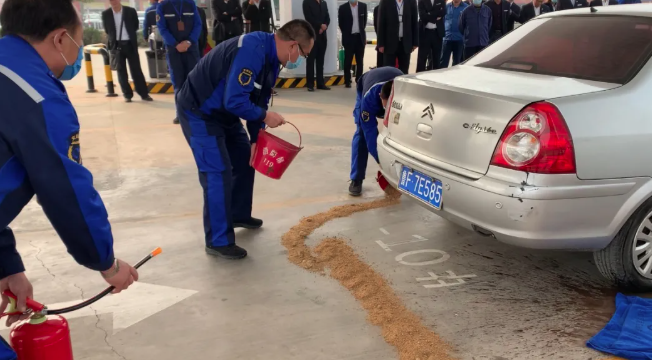 演练正式开始。此次演练模拟加油站车辆油箱口爆燃以及油箱泄露地面着火两种紧急情况。加油员发现“火情”后,第一时间进行启动应急预案,立即按下紧急切断阀,向119报警,并立即停止加油和其他作业。当班加油员员兵分三路,一人提灭火毯、消防沙等消防器材,两人提手提灭火器,两人使用手推式灭火器灭火,在火情现场进行紧急扑救。营业厅人员报警后迅速到达现场,负责疏散引导车辆,保证人员快速有序撤离加油站。经过加油站员工的紧急扑救,“火灾”被成功扑灭,演练取得圆满成功。