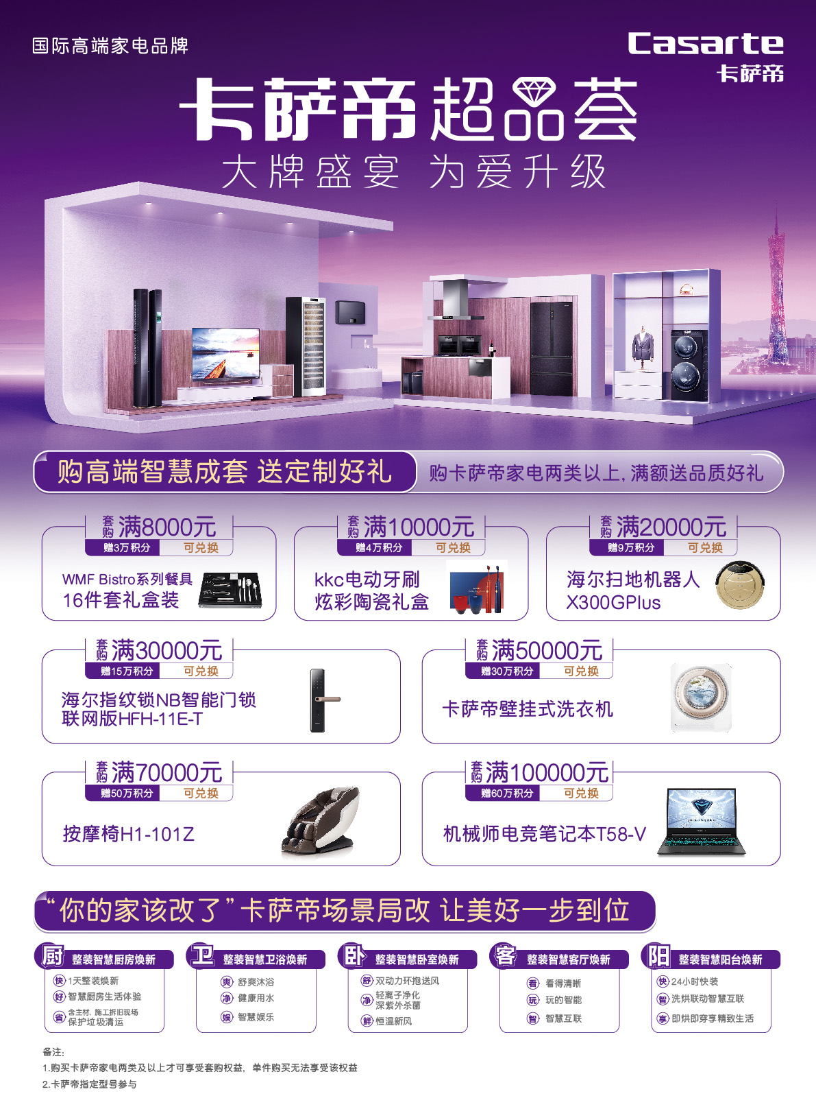 满3万,赠海尔智能指纹锁;满5万,赠卡萨帝壁挂式洗衣机;满7万,赠按摩椅;满10万,赠机械师笔记本电视。