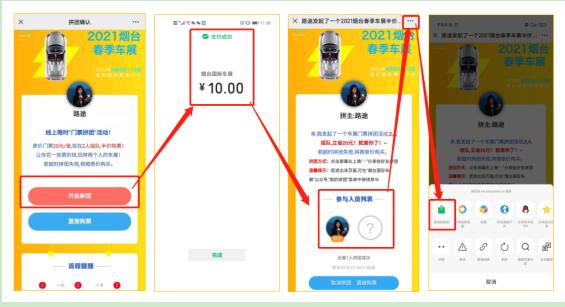 进入拼团活动页面,点击“开启新团”→优先支付10元,享半价门票特惠→进入拼团界面选择图二中的“参与拼团”→“确认拼团”