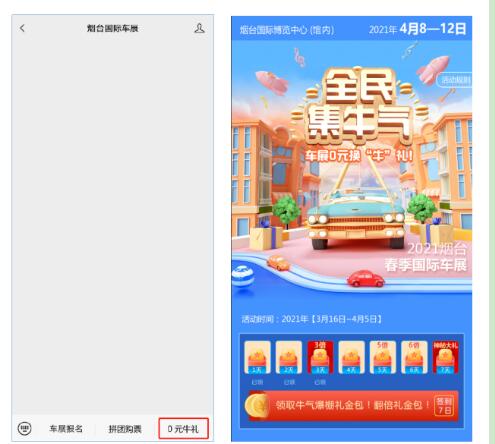 点击“烟台国际车展”公众号底部“0元牛礼”菜单报名参与活动。