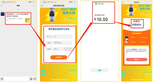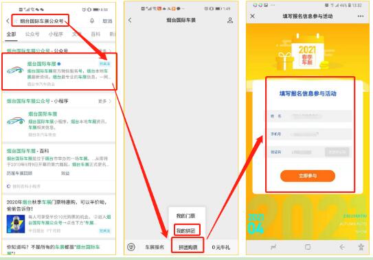 进入烟台国际车展公众号→点击一级页面“拼团购票”→“我的拼团”进入活动界面→填写报名信息