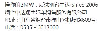 【公司简介】 2006年,BMW授权经销商烟台中达翔宝成立。烟台中达翔宝是港城首家BMW授权经销商,一直努力为港城市民提供创新的产品和服务,传递BMW之悦,并积极投身于社会公益事业。烟台中达翔宝不但经销BMW全线的车型,并且提供高效的维修服务并拥有先进的保养服务技术。经验丰富的专家将竭诚为您提供优质贴心的服务;纯正的原厂配件及全国统一的合理价格,公开、透明。同时能够以积极的服务态度及时解决问题,满足客户的个性化需求,让港城BMW车主尽享便捷。选择BMW卓越经销商,体验中达20年品牌积淀, 感受最纯粹的BMW之悦。