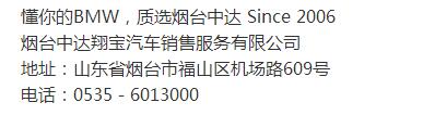 【公司简介】 2006年,BMW授权经销商烟台中达翔宝成立。烟台中达翔宝是港城首家BMW授权经销商,一直努力为港城市民提供创新的产品和服务,传递BMW之悦,并积极投身于社会公益事业。烟台中达翔宝不但经销BMW全线的车型,并且提供高效的维修服务并拥有先进的保养服务技术。经验丰富的专家将竭诚为您提供优质贴心的服务;纯正的原厂配件及全国统一的合理价格,公开、透明。同时能够以积极的服务态度及时解决问题,满足客户的个性化需求,让港城BMW车主尽享便捷。选择BMW卓越经销商,体验中达20年品牌积淀, 感受最纯粹的BMW之悦。