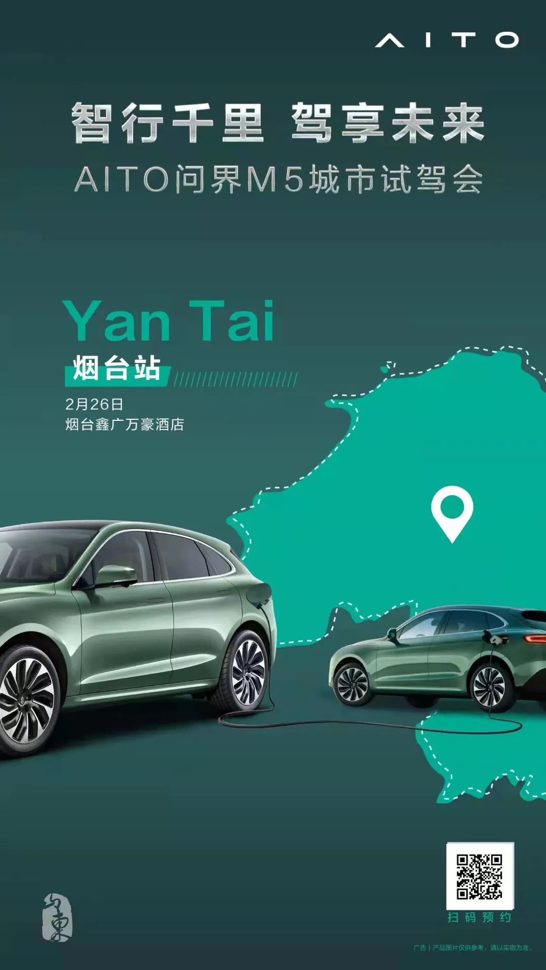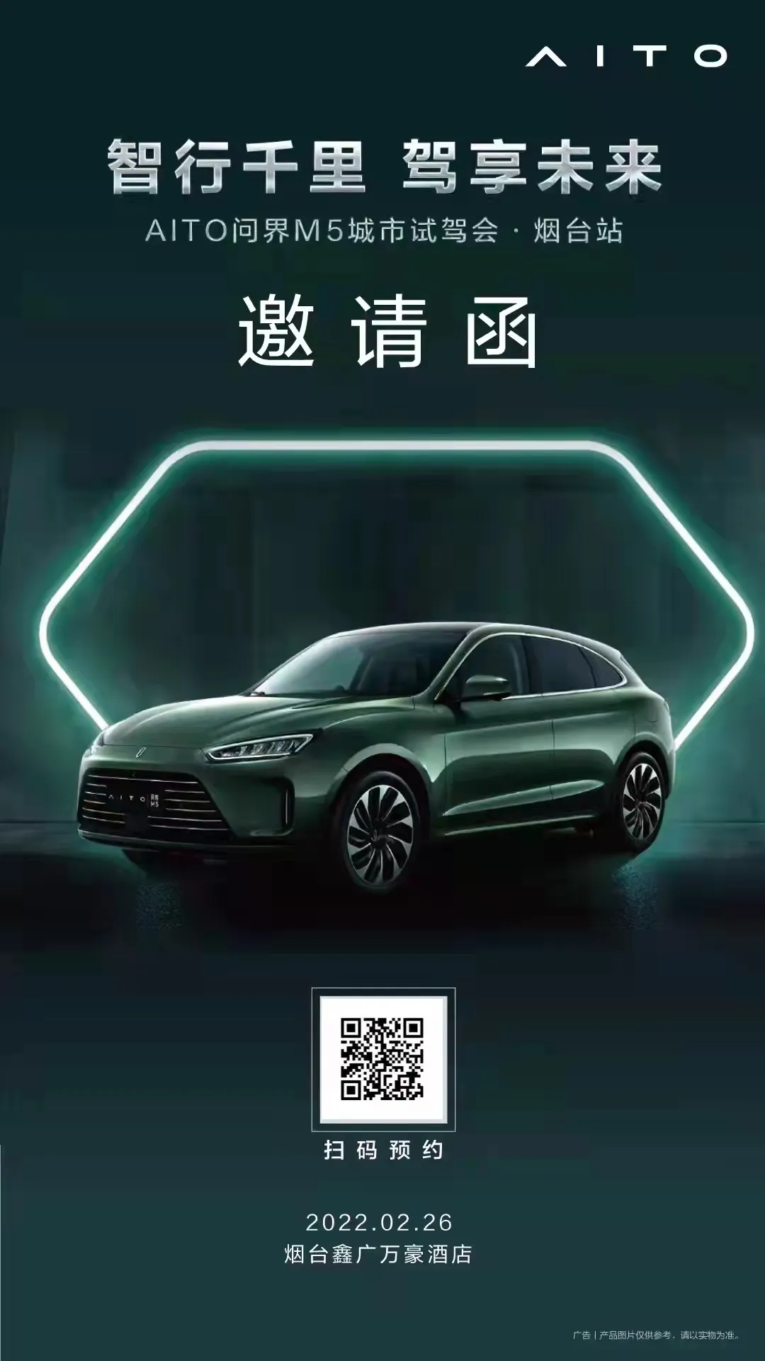 智行未来 | AITO问界M5车友尊享品鉴会将于2022年2月26日(本周六)在烟台鑫广万豪酒店宴会厅举行,我们诚挚邀请您共同探享未来驾驶全新体验。