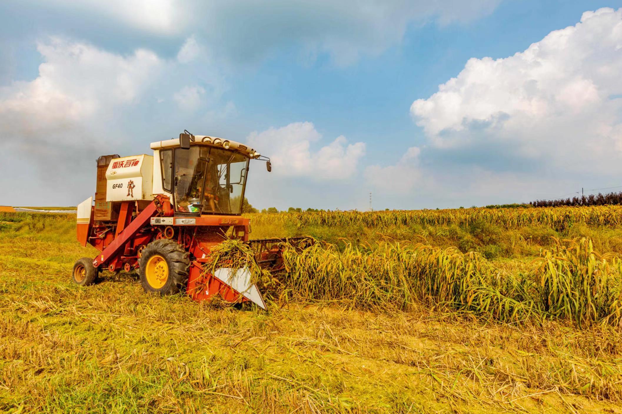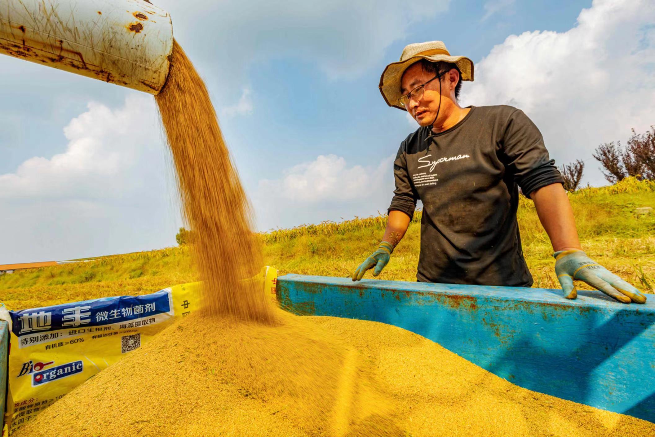 Пересекая непрерывистую горную местность, золотисто-желтое пшено, благоухает золотая осень. Зерно деревни Ни Ваньцзы погрузилось в период созревания с тяжелыми колосьями и полными семенами. Уборочные машины курсировали среди них, что создавалопрекрасную картину осеннего сбора урожая.
