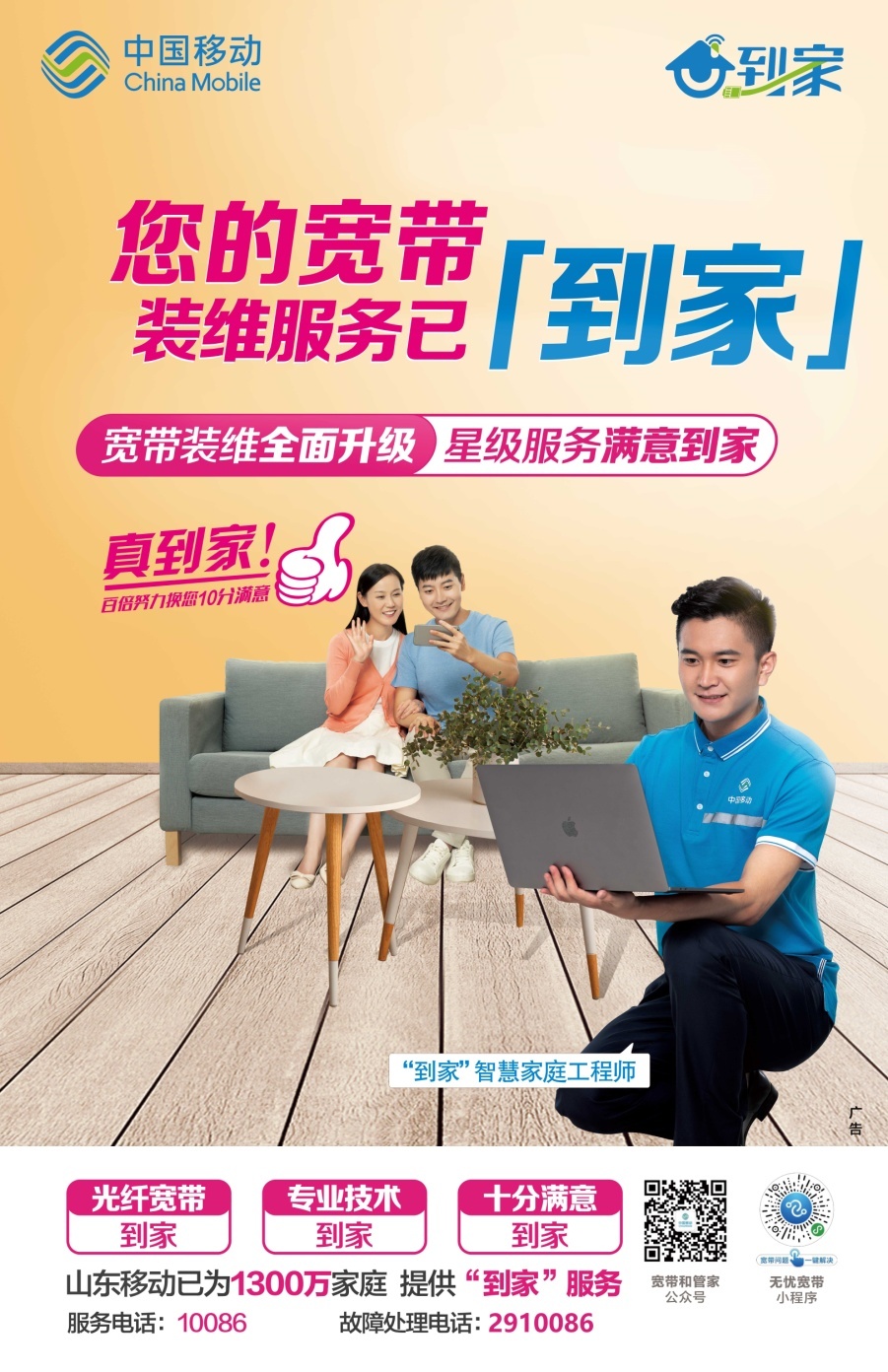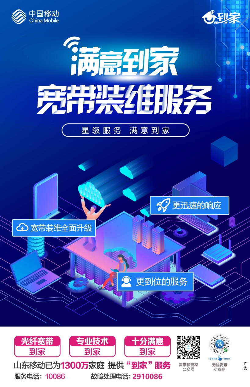 近期,烟台移动宽带“到家”品牌正式推出,宽带装维服务全面升级,更到位的服务、更快速的响应,宽带装维星级服务满意到您家。