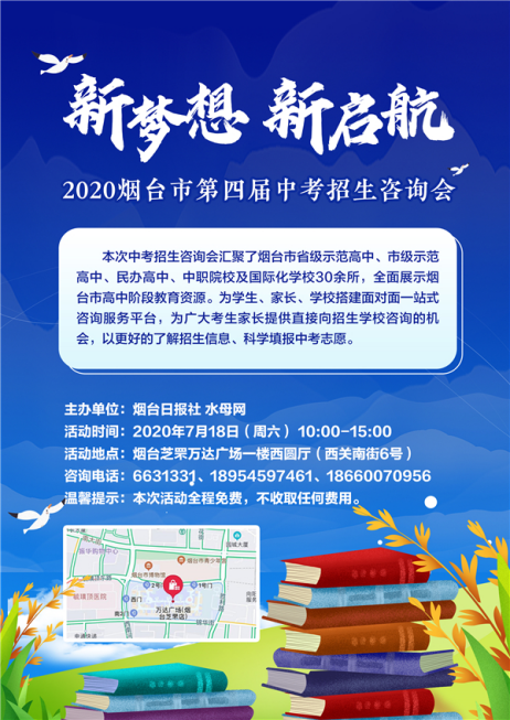 水母网7月15日讯(记者 初明珠)7月18日,“新梦想 新启航”烟台市第四届中考招生咨询会将在芝罘万达广场一楼西圆厅举行。本次咨询会汇聚了烟台市省级示范高中、市级示范高中、民办高中、中职院校及国际化学校30余所,全面展示烟台市高中阶段教育资源。
