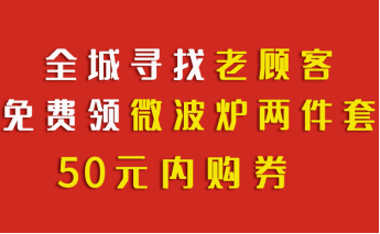 VIP钜惠盛宴,全城寻找老顾客,凭质保发票进店领取微波炉两件套+50元内购券。