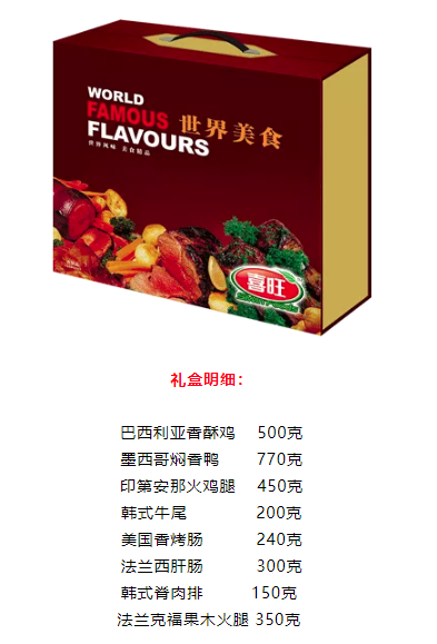 世界美食礼盒是喜旺礼盒中高端、精致并且限量销售的一款礼盒,里面有八种国家的风味特色产品,像墨西哥焖香鸭、印第安那火鸡腿、法兰克福烤火腿等都是原汁原味的国外特色产品,都为礼盒期间特色产品。