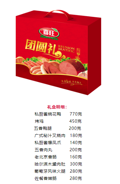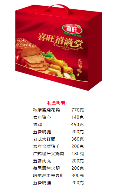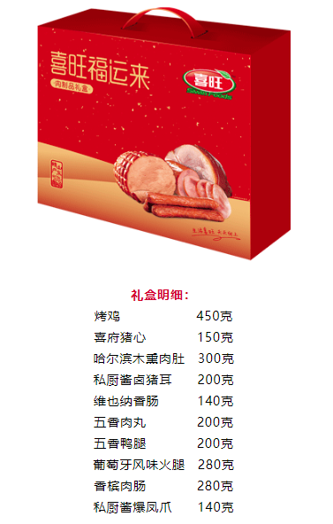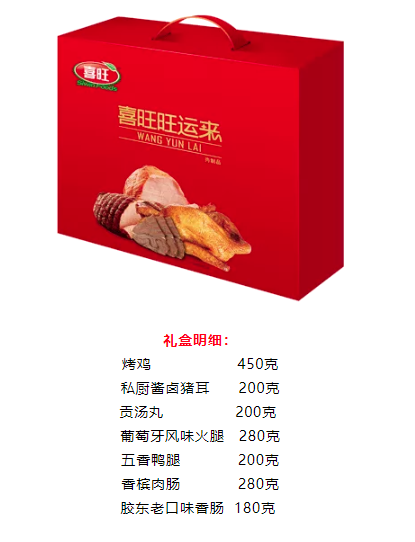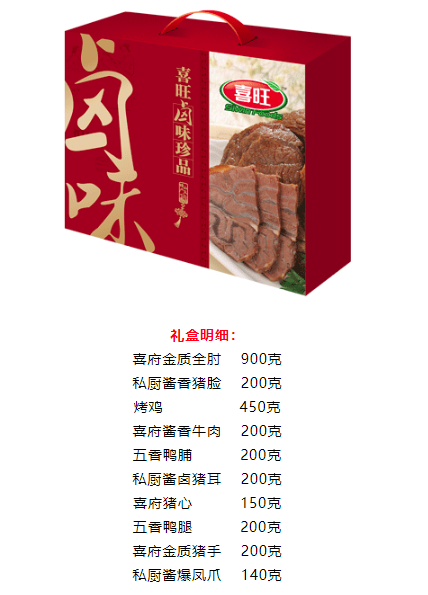 红色喜庆,名字适合春节节日的气氛,这款礼盒有十种单品,像私厨酱烧花鸭、烤鸡、五香鸭腿等喜旺主打产品都有,还有五香肉丸, 老北京香肠等特色美味。而且价格不贵,不论自己食用还是馈赠亲友都是不错的选择。