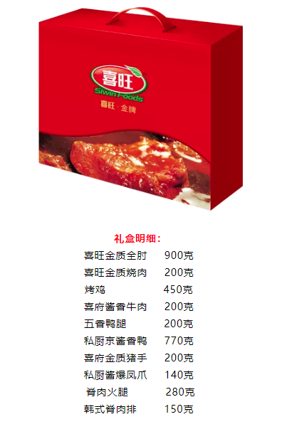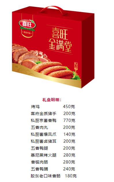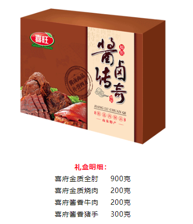 之所以叫金牌礼盒,因为里面的产品都是喜旺20几年畅销的产品,比如喜旺金质烧肉:山东名吃,经过降脂脱腥处理,香而不腻,口味在全国都非常有名。其他的还有喜旺金质全肘、烤鸡、私厨京酱香鸭、喜府金质猪手等,都是喜旺的特色产品。