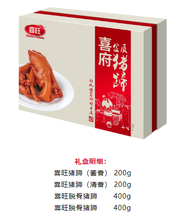 猪蹄礼盒是唯一一款只含有一种产品的礼盒。喜旺脱骨猪蹄是喜旺公司重点新品,上市以来消费者满意度非常高,因此公司专门推出这款礼盒足见对喜旺猪蹄的口味口感都十分有信心。而且猪蹄有清香、酱香两种口味,包装也大气、上档次,适宜馈赠亲朋好友。