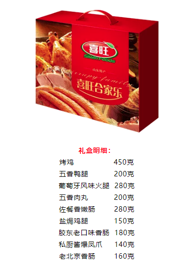 合家乐礼盒,名字喜庆,非常适宜春节的气氛。这款礼盒有9种单品,像喜旺烤鸡、五香鸭腿、葡式风味火腿、五香肉丸等都有,产品搭配营养均衡,价格实惠,不管是走亲访友还是企业福利发放都十分适宜。