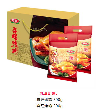 喜旺烤鸡礼盒,内含2款烧鸡,虽然只有一个品类,却也十分受欢迎,为消费者提供了更加多样的选择。