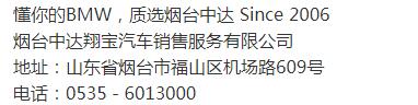【公司简介】 2006年,BMW授权经销商烟台中达翔宝成立。烟台中达翔宝是港城首家BMW授权经销商,一直努力为港城市民提供创新的产品和服务,传递BMW之悦,并积极投身于社会公益事业。烟台中达翔宝不但经销BMW全线的车型,并且提供高效的维修服务并拥有先进的保养服务技术。经验丰富的专家将竭诚为您提供优质贴心的服务;纯正的原厂配件及全国统一的合理价格,公开、透明。同时能够以积极的服务态度及时解决问题,满足客户的个性化需求,让港城BMW车主尽享便捷。选择BMW卓越经销商,体验中达20年品牌积淀, 感受最纯粹的BMW之悦。