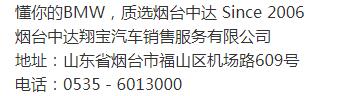 【公司简介】 2006年,BMW授权经销商烟台中达翔宝成立。烟台中达翔宝是港城首家BMW授权经销商,一直努力为港城市民提供创新的产品和服务,传递BMW之悦,并积极投身于社会公益事业。烟台中达翔宝不但经销BMW全线的车型,并且提供高效的维修服务并拥有先进的保养服务技术。经验丰富的专家将竭诚为您提供优质贴心的服务;纯正的原厂配件及全国统一的合理价格,公开、透明。同时能够以积极的服务态度及时解决问题,满足客户的个性化需求,让港城BMW车主尽享便捷。选择BMW卓越经销商,体验中达20年品牌积淀, 感受最纯粹的BMW之悦。