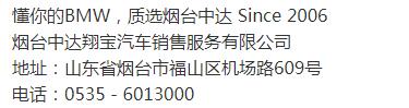 【公司简介】 2006年,BMW授权经销商烟台中达翔宝成立。烟台中达翔宝是港城首家BMW授权经销商,一直努力为港城市民提供创新的产品和服务,传递BMW之悦,并积极投身于社会公益事业。烟台中达翔宝不但经销BMW全线的车型,并且提供高效的维修服务并拥有先进的保养服务技术。经验丰富的专家将竭诚为您提供优质贴心的服务;纯正的原厂配件及全国统一的合理价格,公开、透明。同时能够以积极的服务态度及时解决问题,满足客户的个性化需求,让港城BMW车主尽享便捷。选择BMW卓越经销商,体验中达20年品牌积淀, 感受最纯粹的BMW之悦。