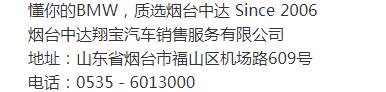 【公司简介】 2006年,BMW授权经销商烟台中达翔宝成立。烟台中达翔宝是港城首家BMW授权经销商,一直努力为港城市民提供创新的产品和服务,传递BMW之悦,并积极投身于社会公益事业。烟台中达翔宝不但经销BMW全线的车型,并且提供高效的维修服务并拥有先进的保养服务技术。经验丰富的专家将竭诚为您提供优质贴心的服务;纯正的原厂配件及全国统一的合理价格,公开、透明。同时能够以积极的服务态度及时解决问题,满足客户的个性化需求,让港城BMW车主尽享便捷。选择BMW卓越经销商,体验中达20年品牌积淀, 感受最纯粹的BMW之悦。