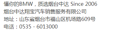 【公司简介】 2006年,BMW授权经销商烟台中达翔宝成立。烟台中达翔宝是港城首家BMW授权经销商,一直努力为港城市民提供创新的产品和服务,传递BMW之悦,并积极投身于社会公益事业。烟台中达翔宝不但经销BMW全线的车型,并且提供高效的维修服务并拥有先进的保养服务技术。经验丰富的专家将竭诚为您提供优质贴心的服务;纯正的原厂配件及全国统一的合理价格,公开、透明。同时能够以积极的服务态度及时解决问题,满足客户的个性化需求,让港城BMW车主尽享便捷。选择BMW卓越经销商,体验中达20年品牌积淀, 感受最纯粹的BMW之悦。