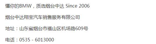 【公司简介】 2006年,BMW授权经销商烟台中达翔宝成立。烟台中达翔宝是港城首家BMW授权经销商,一直努力为港城市民提供创新的产品和服务,传递BMW之悦,并积极投身于社会公益事业。烟台中达翔宝不但经销BMW全线的车型,并且提供高效的维修服务并拥有先进的保养服务技术。经验丰富的专家将竭诚为您提供优质贴心的服务;纯正的原厂配件及全国统一的合理价格,公开、透明。同时能够以积极的服务态度及时解决问题,满足客户的个性化需求,让港城BMW车主尽享便捷。选择BMW卓越经销商,体验中达20年品牌积淀, 感受最纯粹的BMW之悦。