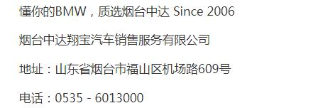 【公司简介】 2006年,BMW授权经销商烟台中达翔宝成立。烟台中达翔宝是港城首家BMW授权经销商,一直努力为港城市民提供创新的产品和服务,传递BMW之悦,并积极投身于社会公益事业。烟台中达翔宝不但经销BMW全线的车型,并且提供高效的维修服务并拥有先进的保养服务技术。经验丰富的专家将竭诚为您提供优质贴心的服务;纯正的原厂配件及全国统一的合理价格,公开、透明。同时能够以积极的服务态度及时解决问题,满足客户的个性化需求,让港城BMW车主尽享便捷。选择BMW卓越经销商,体验中达20年品牌积淀, 感受最纯粹的BMW之悦。