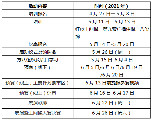 一、比赛项目:八段锦、红歌工间操、第九套广播体操