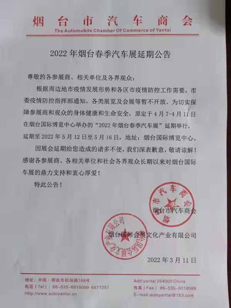 根据周边地市疫情发展形势和各区市疫情防控工作需要,市委疫情防控指挥部通知,各类展览及会展等暂不开放。为切实保障参展商和观众的身体健康和生命安全,原定于4月7-4月11日在烟台国际博览中心举办的“2022年烟台春季汽车展”延期举行,