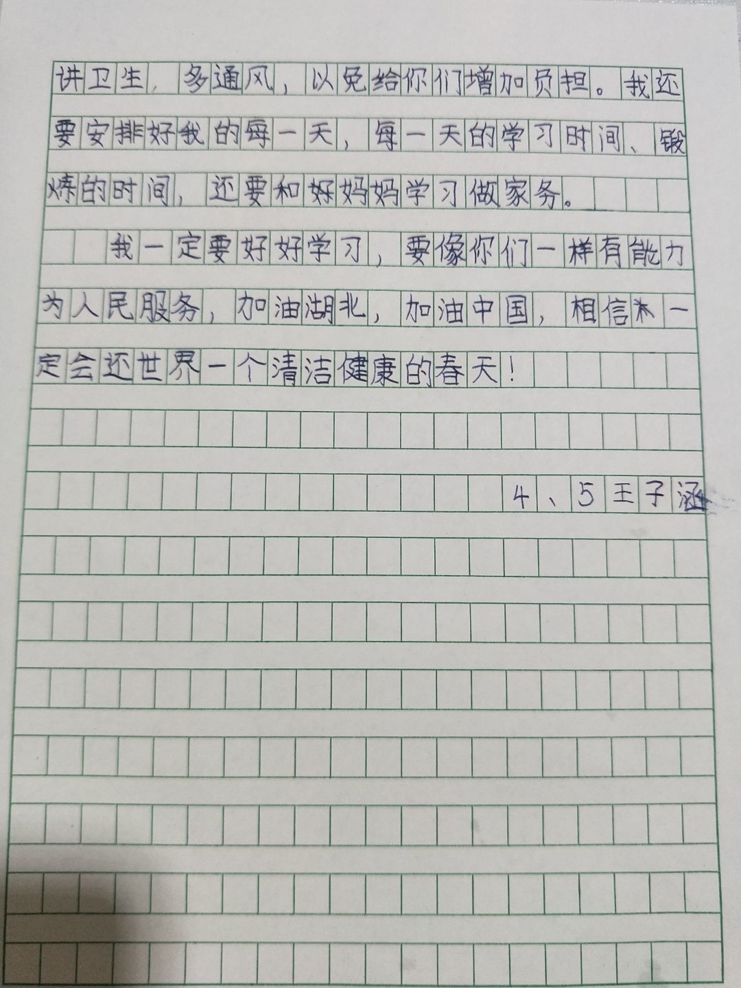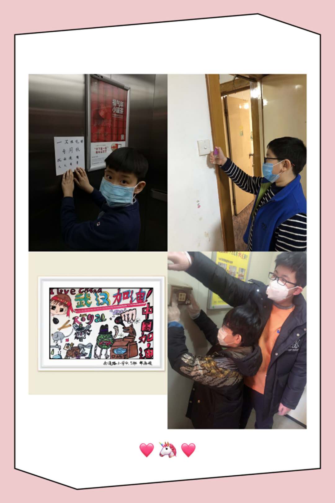 在为武汉加油的同时,南通路小学四年级五班的孩子们积极主动地投入到当前的战“疫”行动中去,加强自我防护,实现健康成长与学习求知的双赢。坚守“不外出、不聚集、不信谣、不传谣”的防疫纪律,认真完成老师布置的每一项作业,做防控疫情宣传员,把各类防疫知识向家长宣传。
