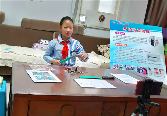 莱州市实验小学于子衿同学在线为省赛评委介绍其科技创新成果——多功能减震锤