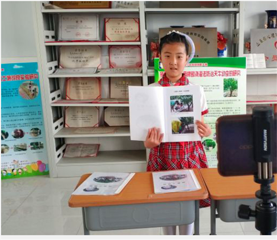 莱州市郭家店镇中心小学 刘昊琳同学在线为评委介绍其科技创新成果—— 拯救小桃树