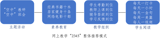 成立线上教学、大赛辅导、读书指导、素养教育等专班8个、学科小组15个。创新网格管理,部长、教师、班长、组长加入教师群、班级群、家长群,层层负责,“群群”发力,“群”管“群”治。构建网上教学“2345”整体推进模式。主题活动“两个会”:“空中”教研、“空中”班会定期举行。素养教育“三个十”:推送经典书籍十本、居家健身十条、网络电影十部通用“菜单”。教学组织“四到位”:学生考勤到位、教师上课到位、辅导答疑到位、学习反馈到位。学生阅读“五个一”:每天一打卡、每天一小时、每天摘录一条金句、每周制作一篇美篇、每人录制一个朗读视频。收录金句摘抄超万条,推荐朗读作品200个,培养朗读达人400人。