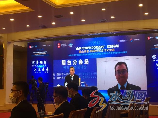 水母网10月22日讯(记者 张奕 实习生 段虹飞)10月22日,“山东与世界500强连线”韩国专场暨山东省·韩国经贸合作交流会后,烟台分会场活动在东山宾馆举行,市委书记张术平致辞并分别与希杰集团驻华总部朴恩模副总裁,韩国SK化工俞容培总经理连线对话。市委常委、秘书长于松柏出席,副市长张代令主持。中国驻韩国大使馆经商处商务参赞王治林,韩国斗山集团中国区总裁兼中国韩国商会会长李浩哲,希杰集团中国总部副总裁朴恩模,韩国SK化工公司总经理俞容培,烟台投资重点企业代表,烟台市有关部门和单位负责同志,区县重点韩资项目签约代表出席活动。