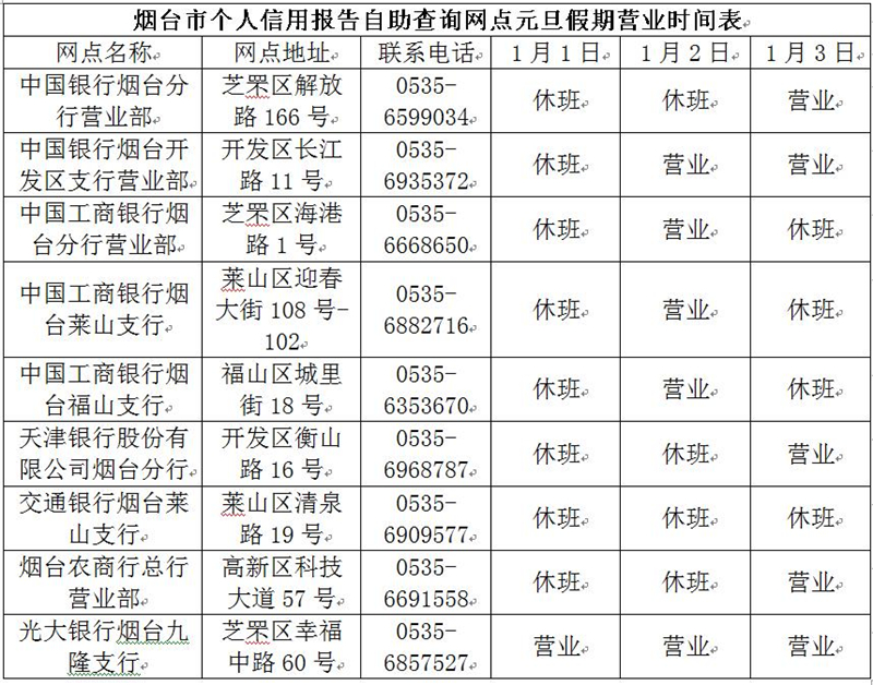 为做好2021年元旦假期商业银行个人信用报告自助查询网点的服务工作,方便社会公众正常办理个人信用报告的查询业务,2020年12月31日,中国人民银行烟台市中心支行向社会公布了2021年烟台市元旦假期期间商业银行个人信用报告自助查询网点营业时间。