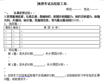 每次考试以后,布置学生运用试卷分析模板进行考后分析和反思,总结失分原因,明确改进措施,在反思中不断进步。