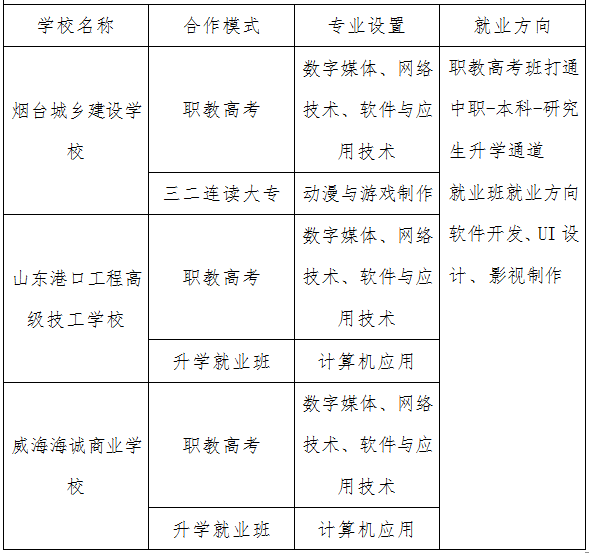 目前,在烟威地区与众多优秀中职学校达成院校合作,烟台城乡建设学校,山东港口工程高级技工学校以及威海市海诚商业学校等;合作院校中的校企合作班均有职教高考精英班与高质量升学就业班两种班型。