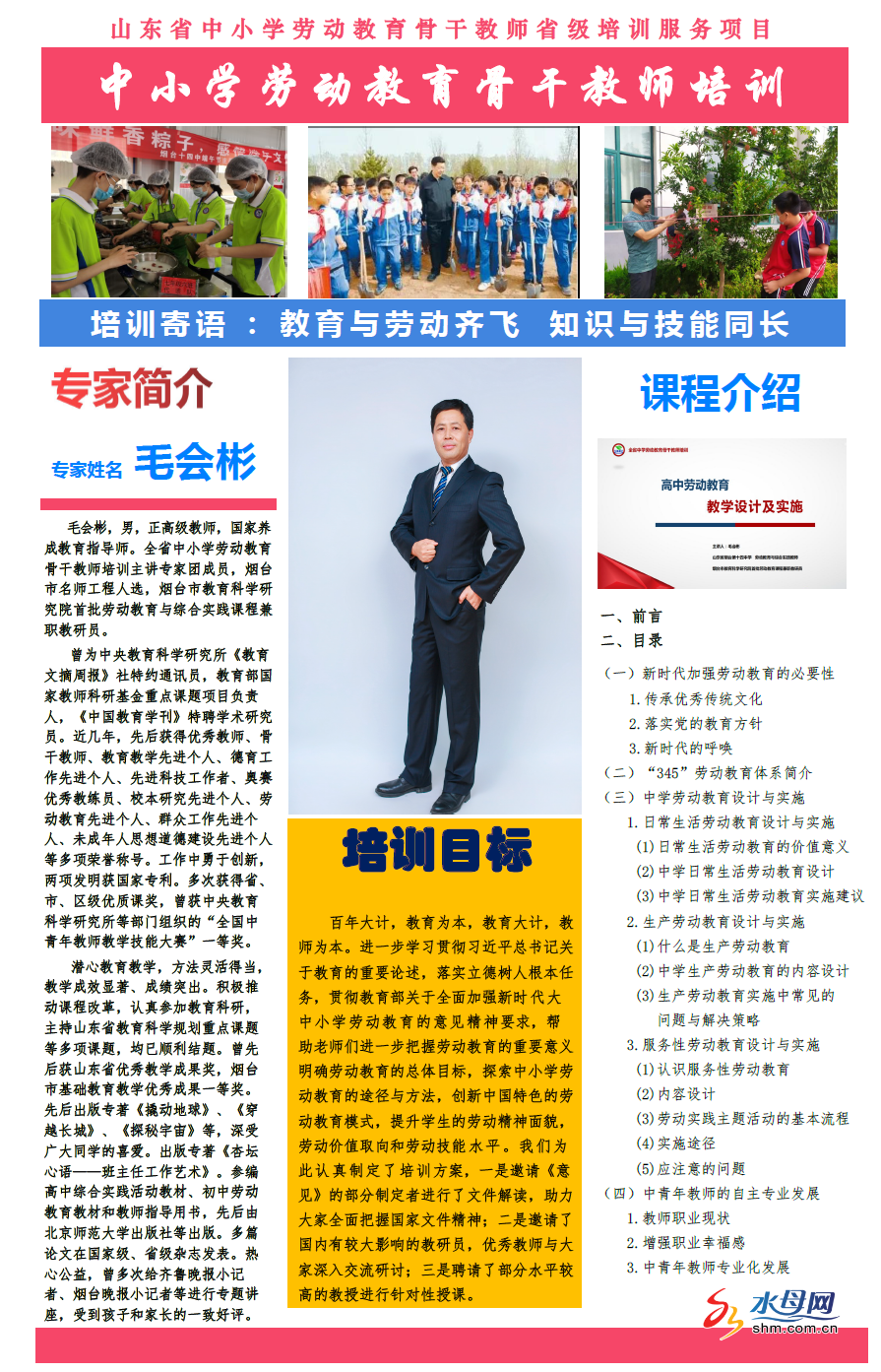 毛会彬,男,正高级教师,国家养成教育指导师。全省中小学劳动教育骨干教师培训主讲专家团成员,烟台市名师工程人选,烟台市教育科学研究院首批劳动教育与综合实践课程兼职教研员。