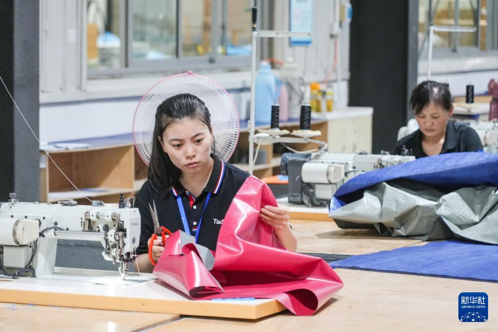 8日、泰山体育産業集団傘下の山東泰山体育器材で、レスリングマットを加工する従業員。(済南=新華社記者/朱崢)
