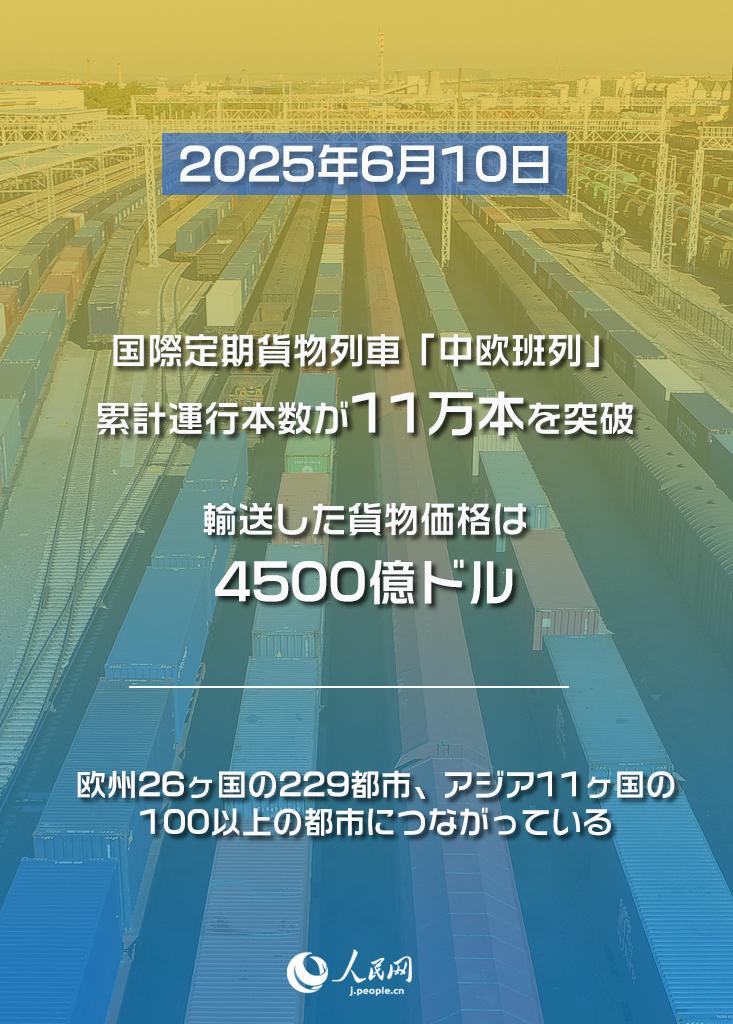 6月10日午前8時頃、国際定期貨物列車「中欧班列」の75052号が山東省青島市の膠州駅をゆっくりと出発した。これにより中欧班列の累計運行本数が11万本を突破し、輸送した貨物価格は4500億ドル(1ドルは約144.8円)に達した。