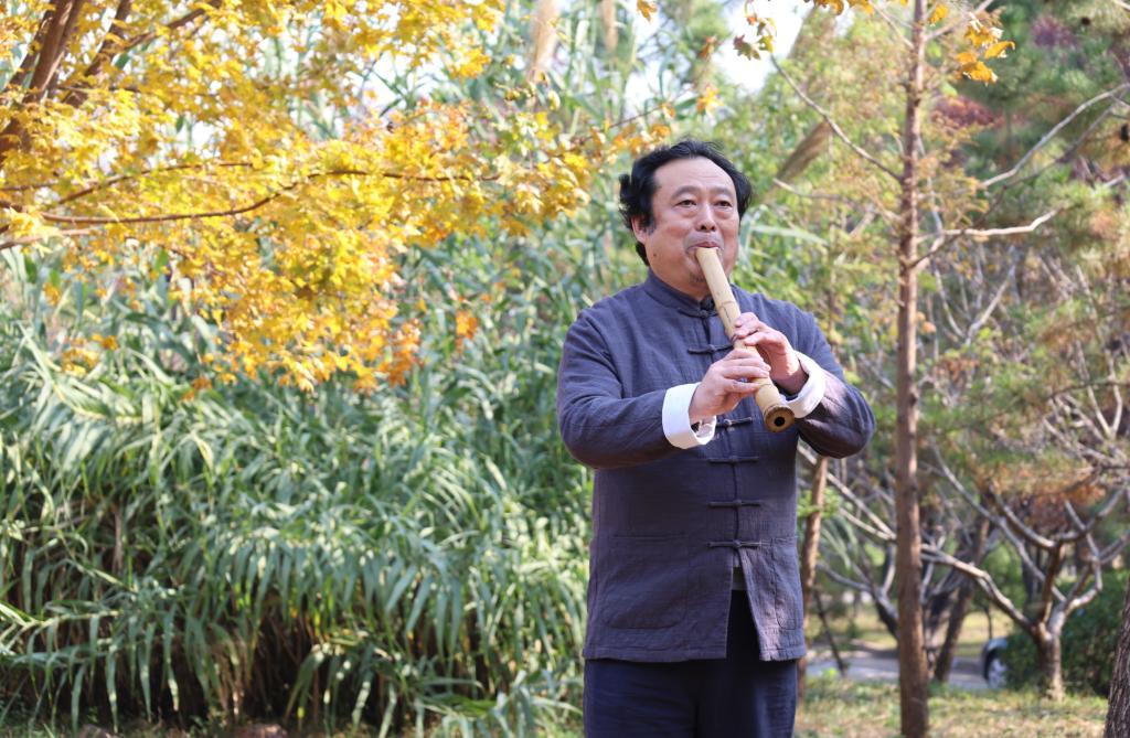 5日、尺八を演奏する愛好家の劉哲さん。(聊城=新華社記者/張力元)