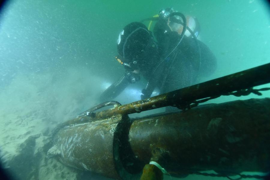 威海湾に沈む「来遠」で、砂を取り除く調査隊員。(済南=新華社配信)