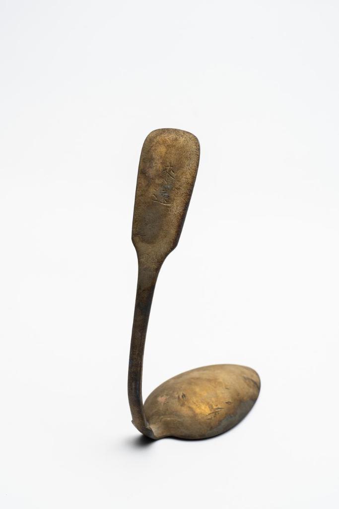 威海湾に沈む「来遠」から引き揚げた艦名刻印のある銅製スプーン。(済南=新華社配信)